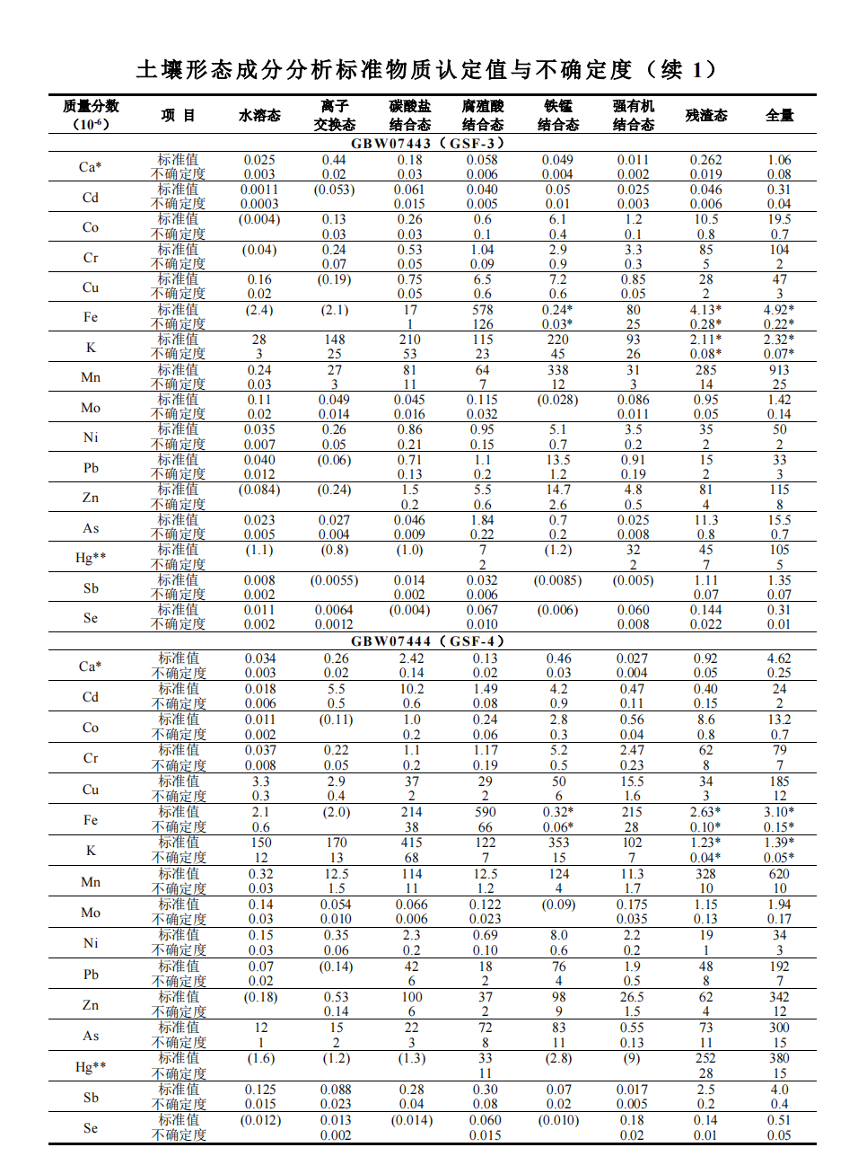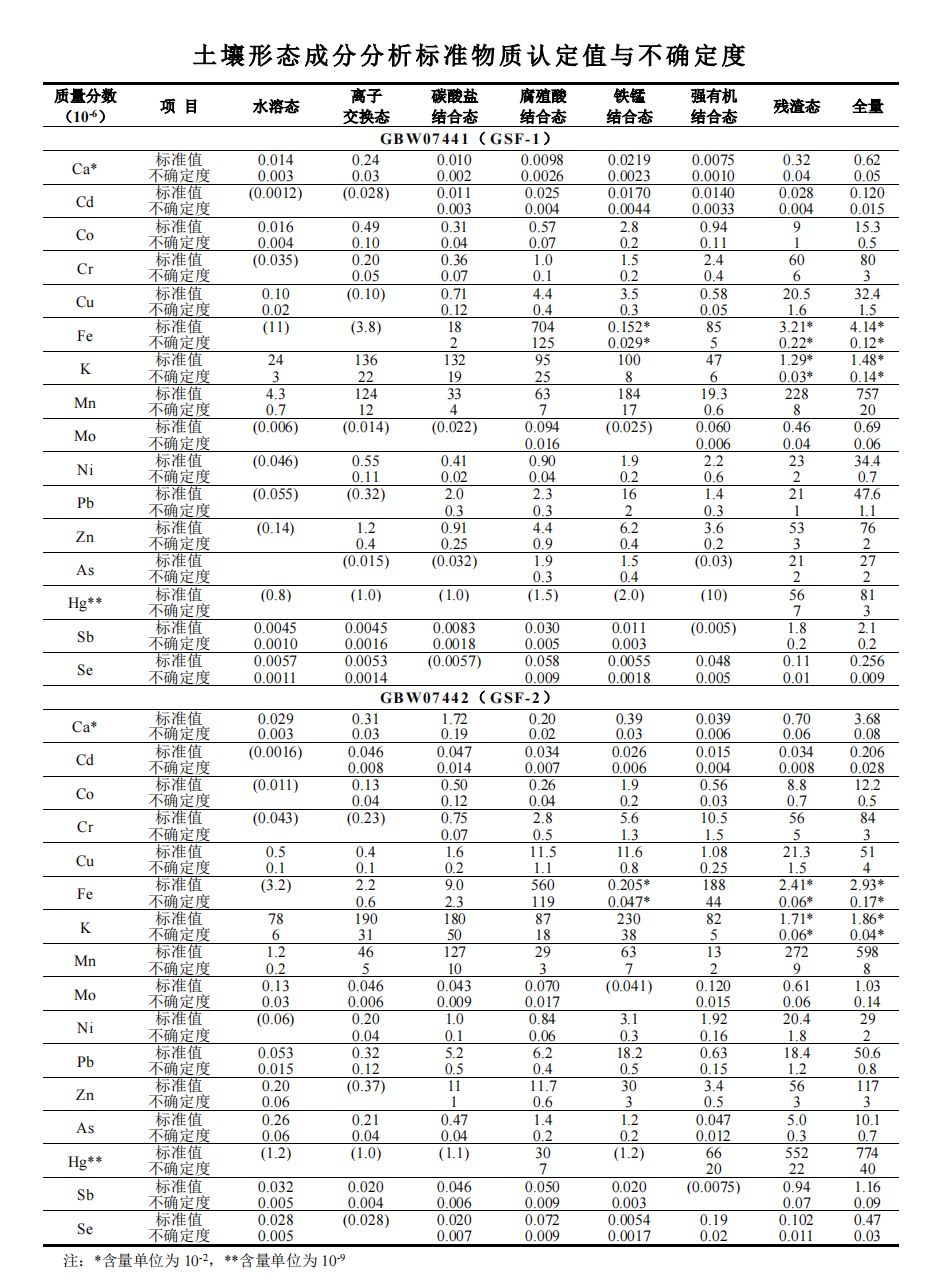 土壤形态成分标准物质由不同类型和成因的土壤与沉积物计 5 个样品组成,包括七步顺序提取形态成分的值及采用 DTPA 与 AB-DTPA 浸提的有效态成分的值。可供多目标地球化学调查与评价及农业和生态环境研究中土壤与沉积物形态和有效态成分分析作量值比对和分析质量监控标准。